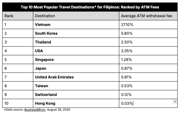 Wise, the global technology company building the smartest way to spend and manage money internationally, recently revealed the most expensive places to withdraw cash overseas – and some of Filipinos’ favourite travel hotspots are the worst offenders. Vietnam topped the list with an average fee of 27.10%, followed by South Korea at 5.80%, Thailand at 2.50%. and the US at 2.05%.1